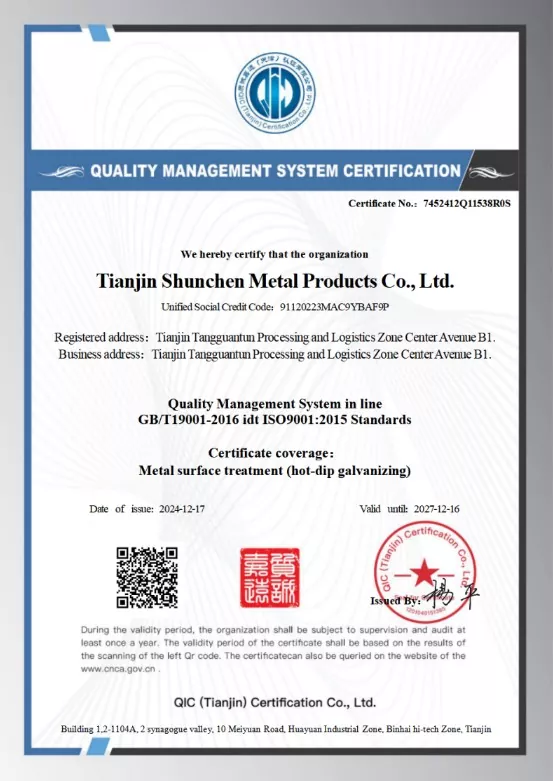 قابل اعتماد معیار کے لیے Shunchen کا انتخاب کریں۔ ہم Q235B یا Q355B کا اعلیٰ معیار کا سٹیل استعمال کرتے ہیں، جو سنکنرن مزاحمت کے لیے ہاٹ ڈِپ گیلوانائزنگ کے ذریعے پروسیس کیا جاتا ہے۔ زنک کے برتن کا درجہ حرارت 450-460 ڈگری سیلسیس کی حد کے اندر درست طریقے سے کنٹرول کیا جاتا ہے تاکہ زنک کی کوٹنگ کی مضبوط چپکنے کو یقینی بنایا جا سکے اور کوئی جگہ چھوٹ نہ جائے۔ ہماری مصنوعات ISO9001 کوالٹی سسٹم سرٹیفیکیشن کی تعمیل کرتی ہیں اور انہیں تھرڈ پارٹی زنک کوٹنگ انسپکشن رپورٹس کی حمایت حاصل ہے۔